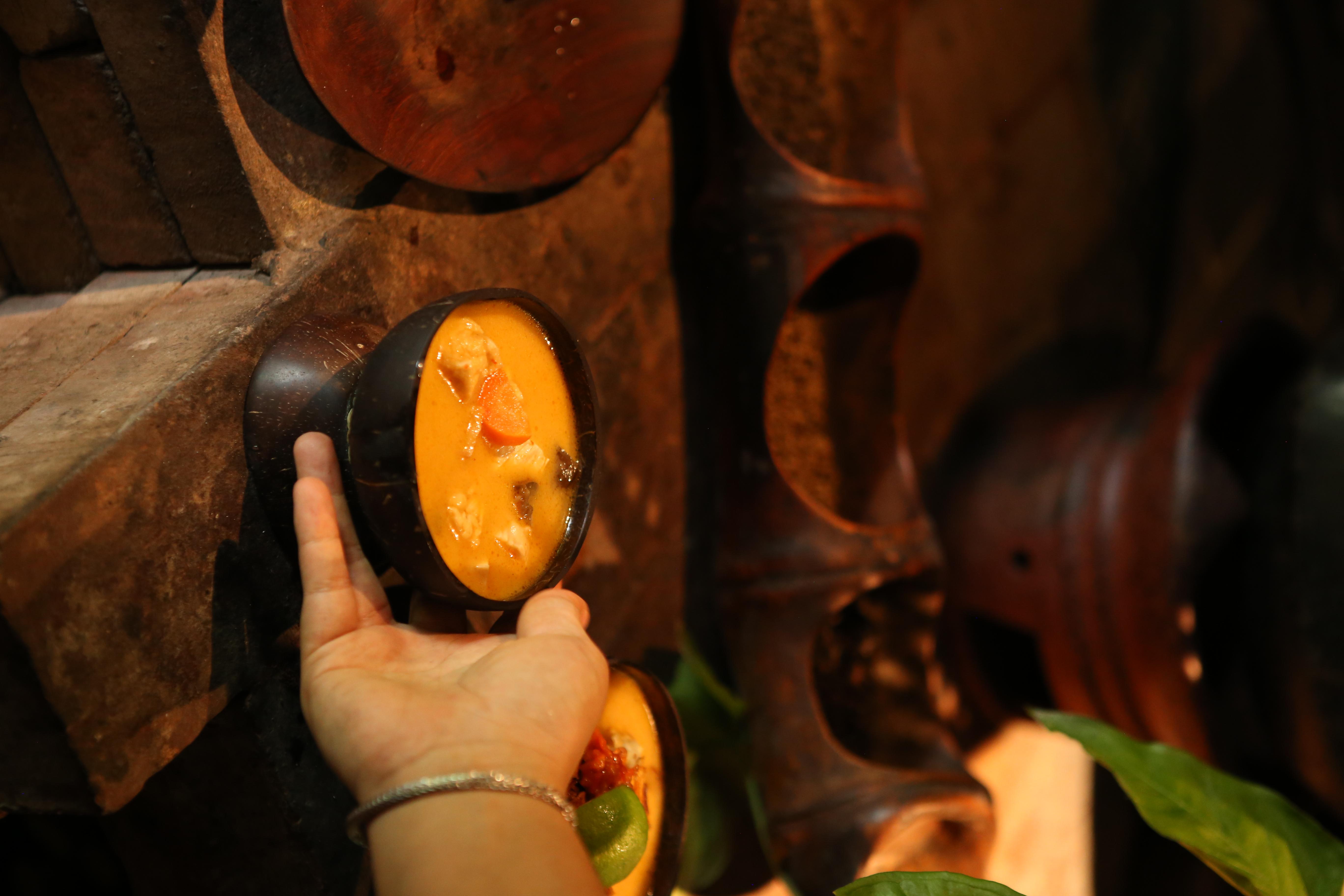 A traditional Balinese Christmas buffet with a welcome arak cocktail, riverside open-air dining, wood-fired vegetables, meat roasts, seafood, sambals, and heritage desserts