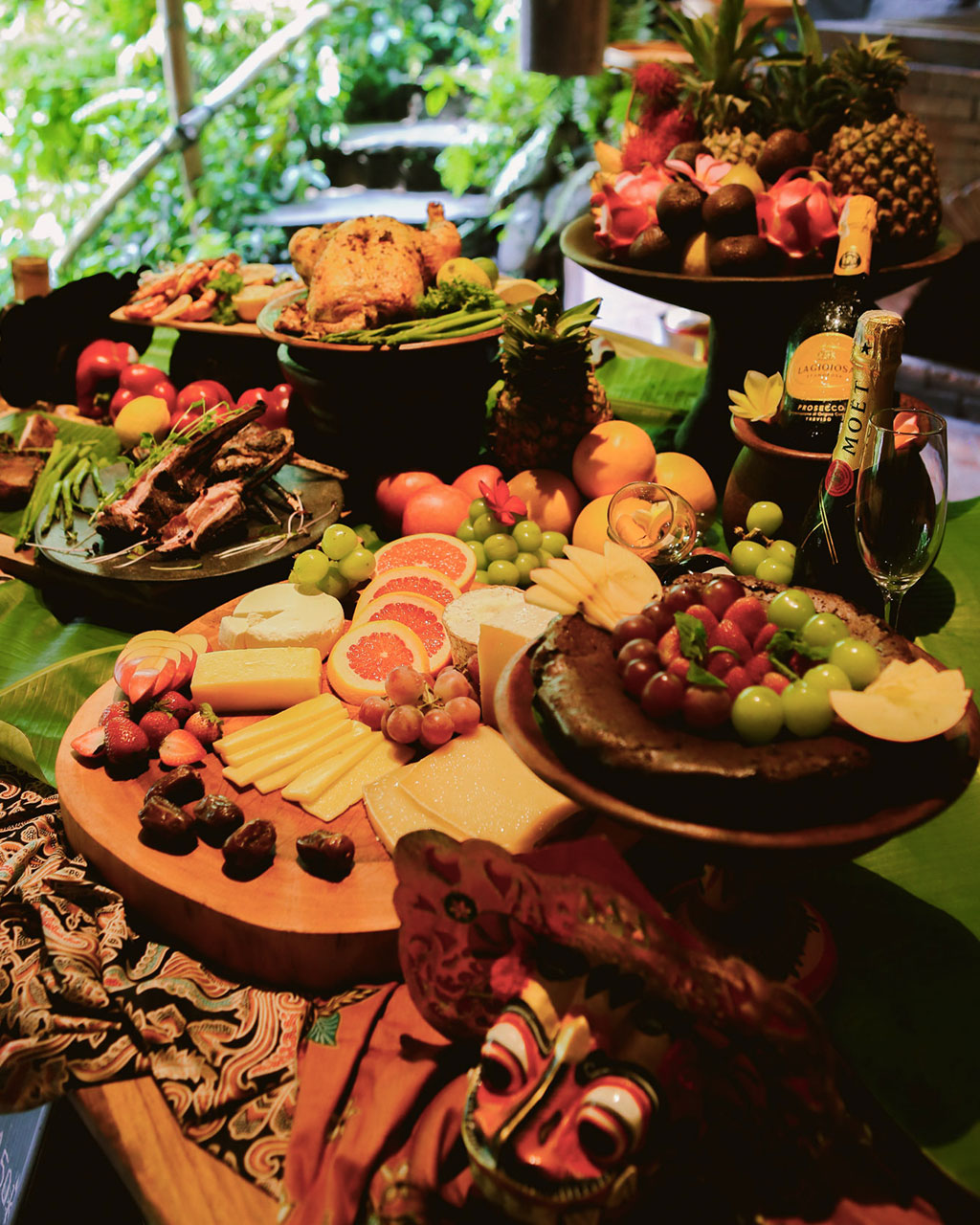 A traditional Balinese Christmas buffet “The Ayung River Feast” with a welcome arak cocktail, riverside open-air dining, wood-fired vegetables, meat roasts, seafood, sambals, and heritage desserts